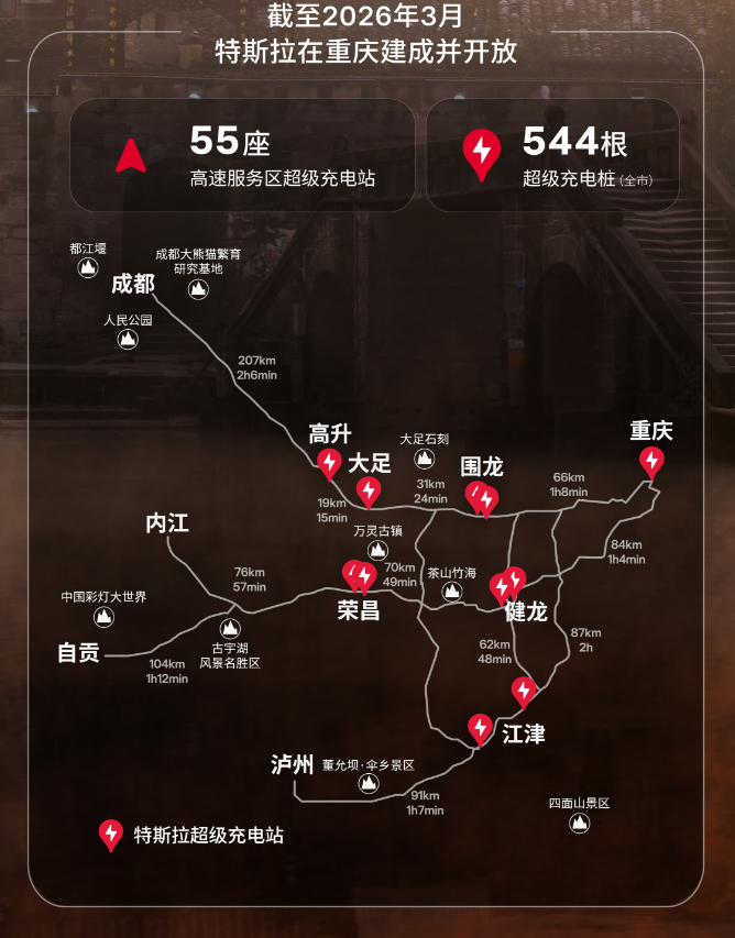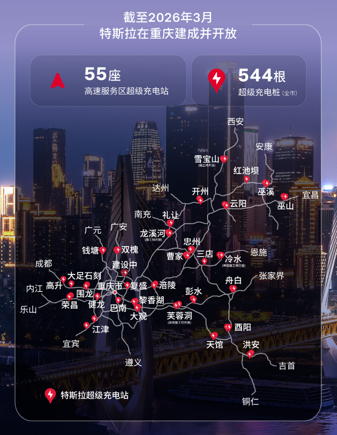 今天,特斯拉在重庆一次性把55座高速服务区超充站直接铺开了,而且是特斯拉进入中国以来,规模最大的一次性高速服务区超充落地。