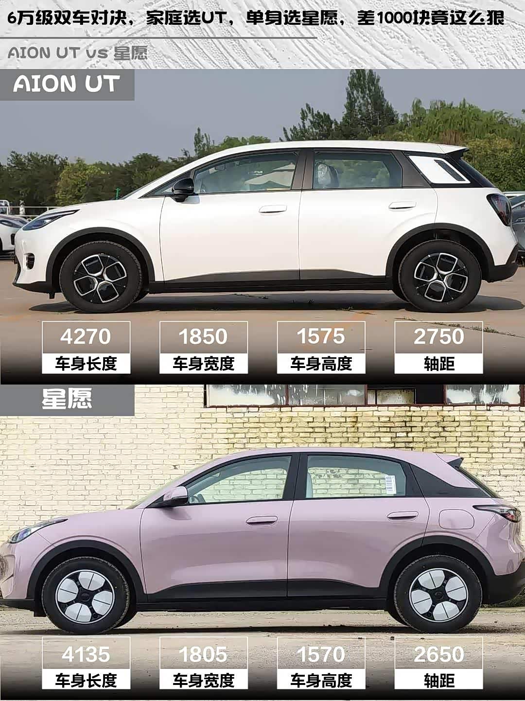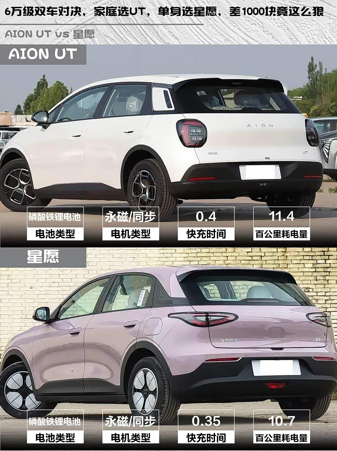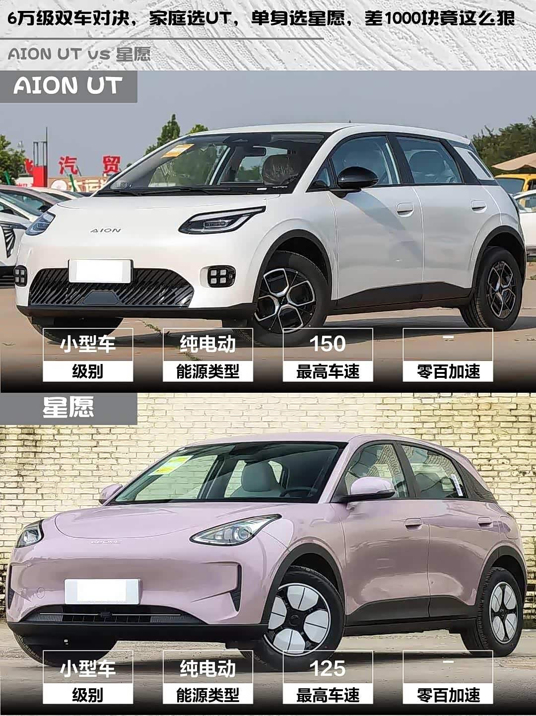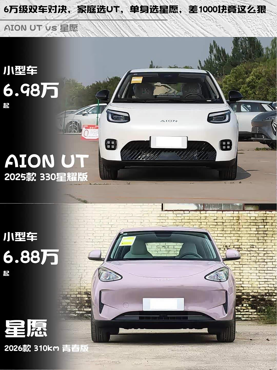 车家号·0浏览·2026-03-29 08:35 · 北京最近在选小型纯电车的小伙伴看过来!今天深度对比两款热门车型—— AION UT(参数|询价) 2025款 330星耀版和星愿2026款 310km青春版,帮你解决选择困难症!🚗💨
