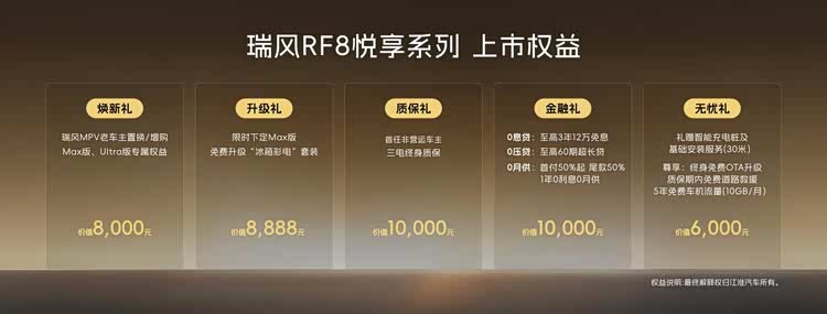 当MPV从单一的商务属性逐渐走向家庭多场景应用,用户对于一台车的期待也在发生变化——既要空间舒适,又要驾驶轻松,还要足够安全与智能。在这样的背景下,2026年3月28日,瑞风RF8悦享系列在瑞风用户之夜正式上市。新车推出Pro、Max、Ultra三款配置版本,限时抢购价17.69万元-22.69万元,并同步带来至高价值70888元的7重尊享购车大礼,以及面向老车主的多项专属升级权益。