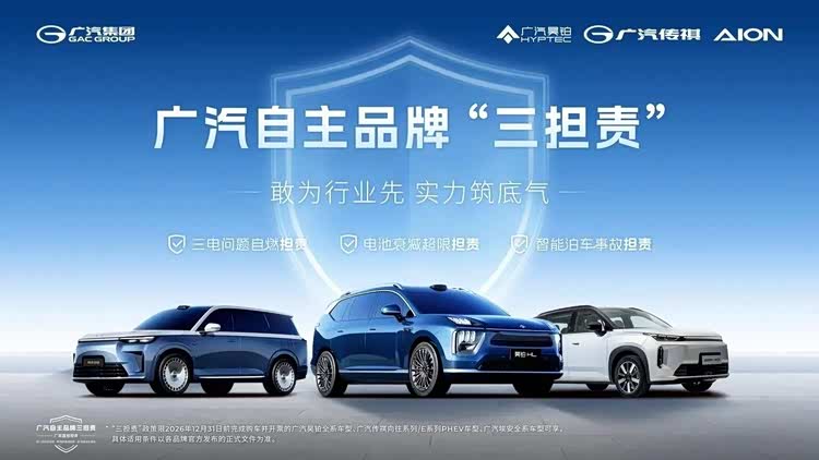 更难得的是,广汽的诚意不止于产品端的全面布局,更在于直面用户的核心焦虑给出兜底方案。当下新能源汽车市场,消费者最怕的从来不是车价高低,而是三电安全没保障、电池衰减维权难、智能功能出事故责任扯皮。针对这些行业痛点,广汽旗下三大自主品牌早在2025年12月就联合推出行业首创的“三担责”政策,重磅承诺三电问题自燃、电池衰减超限、智能泊车事故均由厂家担责,成为中国自主品牌首个吃下这颗“定心丸”的车企。这份全周期的安心保障,直接把中国汽车产业的竞争,从低水平的价格内卷,拉向了更高维度的价值比拼。
