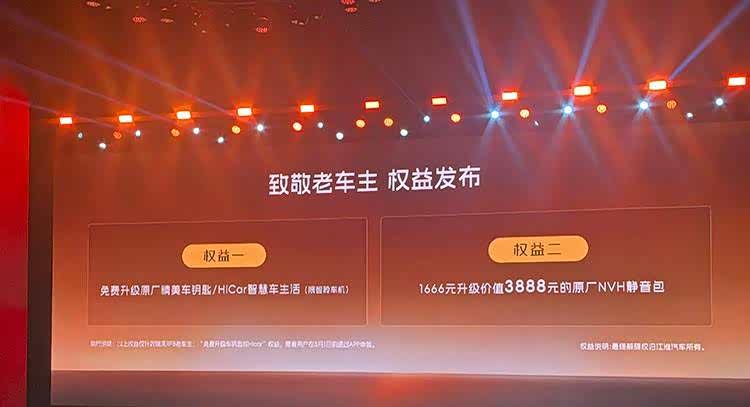 同时,厂家还为购车用户准备了最大价值70888元的尊享购车大礼,老车主购车还能额外享受两大权益:升级原厂车钥匙或HiCar智慧车生活以及1666元升级原厂NVH静音包。