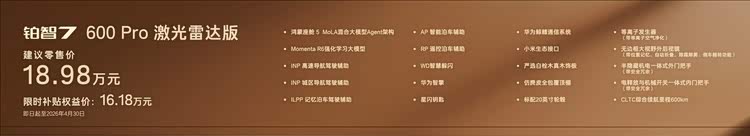 700km续航提供三个版本,全部标配双电机零重力座椅、主驾大腿托、后排智能触控面板和23扬声器等超11项配置,过往30万以上车型的豪华舒适配置,全部下放到20万以下。700Max版聚焦长续航与高阶舒适,限时补贴权益价16.58万,加5000元即可选装行业最低价的双腔空悬,拥有17万级双腔空悬纯电家轿第一车。700Max激光雷达版限时补贴权益价17.48万,增加Momenta R6大模型高阶智驾辅助。再加5000元选装基金即可升级至700Max激光雷达双腔空悬版,一次性配齐华为鸿蒙座舱5、Momenta R6大模型激光雷达智驾、双腔空悬等超豪华三件套,20万内唯一。