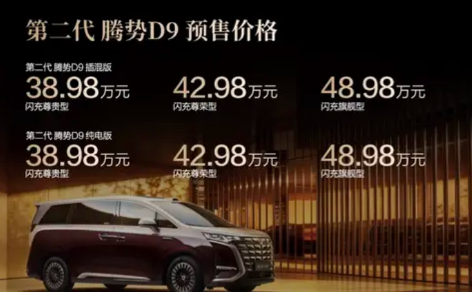 新款腾势 D9 一共推出 6 款闪充车型,插混和纯电各三款车型,预售价格区间为38.98 万 - 48.98 万元,4月份就可以到店看车试驾了,这样的节奏还是很快的。
