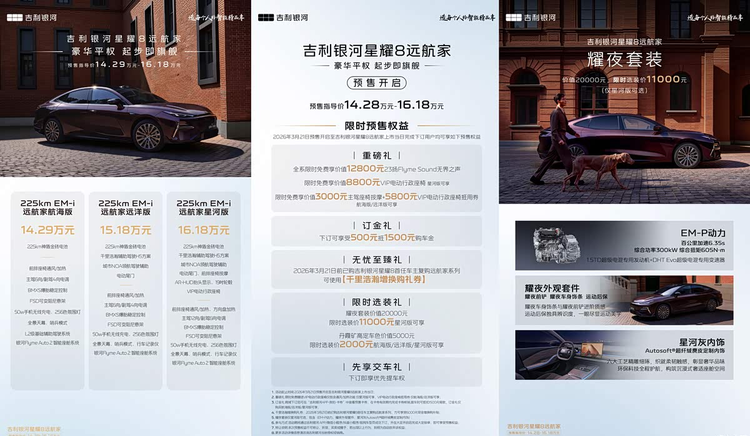 一款备受关注的中大型纯电轿车,即将揭开最终的价格面纱,从吉利银河官方获得确认,星耀8的远航家系列车型,计划在3月30日正式推向市场。在此之前,这款新车已经启动了预售环节,公布了三种配置选择,预售价格的范围在14.28万元到16.18万元之间。对于一直在关注它的消费者来说,月底的上市活动意味着所有悬念将最终落地。