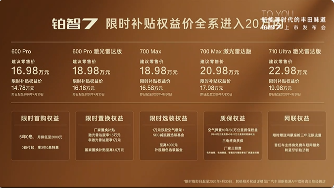 今天,3月29日,继任者 铂智7(参数|询价)正式上市。限时补贴权益价14.78万-19.98万元,全系杀入20万内。比预售价整整又低了1万元。600 Pro激光雷达版16.18万,700 Max激光雷达版17.48万,顶配710 Ultra激光雷达版19.98万。并且还保留了预售期所有的厂家置换补贴、选装基金、空悬延保三大权益。更狠的是,针对首购车主,直接给5年0息。