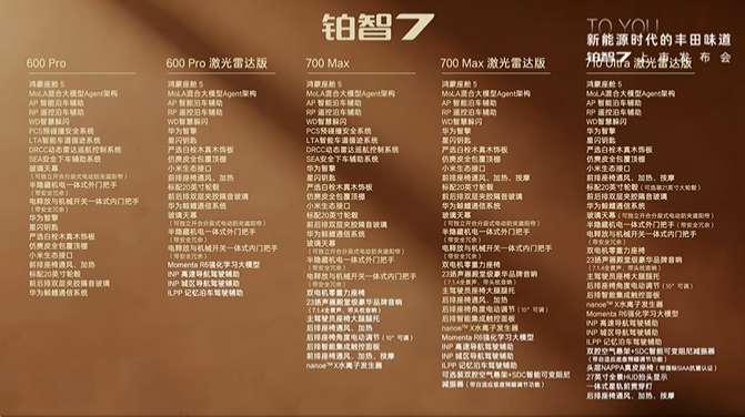 铂智7是丰田首款搭载华为鸿蒙座舱的量产车型之一,版本为鸿蒙座舱5.0(满血版),内置MoLA混合大模型Agent架构。