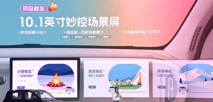 在智能端,第五代宏光MINIEV凭借EEA3.0智能域控架构,已经支持云端后台OTA升级;同级首发的10.1英寸妙控场景屏,内置了四种场景模式,采用全新的萌趣UI设计,下滑即可打开控制中心使用17项高频功能。