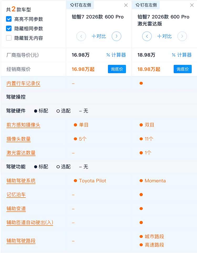 如车名所示,两台车的主要差别就是激光雷达。600 Pro激光雷达版多出了一颗激光雷达,所以支持城市和高速的NOA;实际上,这台车入门版也搭载了L2级别的驾驶辅助系统,但是使用的是丰田的Toyota Pilot智驾辅助系统,而600 Pro激光雷达版直接上了Momenta的智驾系统;同时还多出了车内的行车记录仪。