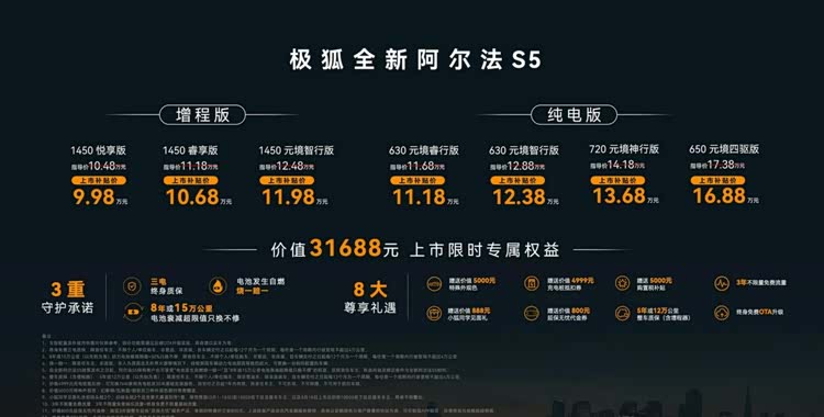 全新极狐阿尔法S5正式上市,指导价10.48-17.38万,同时官方推出上市补贴价9.98-16.88万,并提供价值31688元限时专属权益。