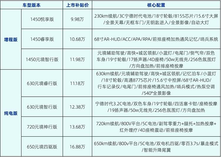 增程版的另外两款,售价10.68万和11.98万的1450睿享版和1450元境智行版,主要在于智驾系统和舒适性配置的差异,两款车价差1.3万,换来的是更好的驾驶辅助配置,钱包充裕的话完全值得买高配。