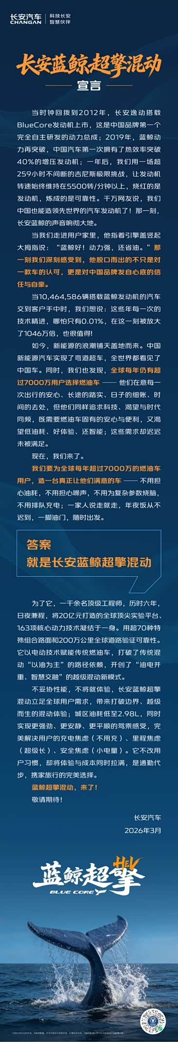 3月12日,长安汽车发布《长安蓝鲸超擎混动宣言》,明确提出以电动技术赋能传统燃油车,打破传统混动“以油为主”的路径依赖,开创了“油电并重、智慧交融”的越级混动新模式。