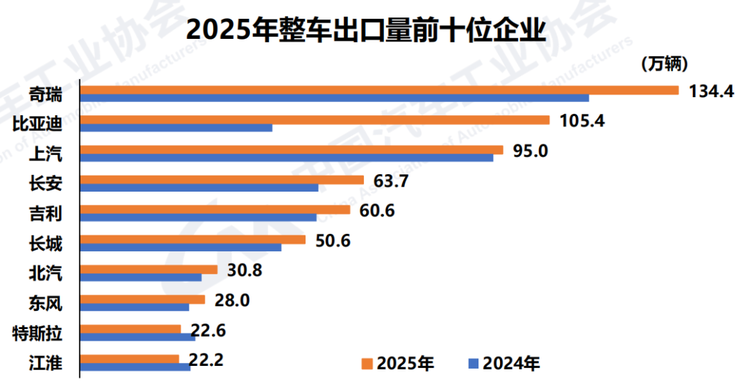 第一,规模上的含金量。2025年,中国汽车出口总量超过832万辆,奇瑞一家就贡献了将近130万辆,占比接近16%。也就是说,每10辆出口的中国汽车里,就有将近2辆是奇瑞。而在中国民营企业的出口营收排名中,奇瑞的出口占比体量不仅大,而且是出海最久、保持单一产业出口第一时间最长的企业。