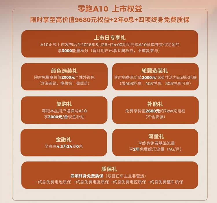 还值得一提的是,自即日起至2026年4月30日24时,零跑A10推出限时上市权益,包含选装礼、复购礼、补能礼、金融礼、流量礼、质保礼等多重好礼,限时权益价值高达9680元。具体包括限时免费享价值2000元个性外饰色,赠送家用充电桩,享终身免费基础流量,终身免费电池质保,终身免费整车质保等。