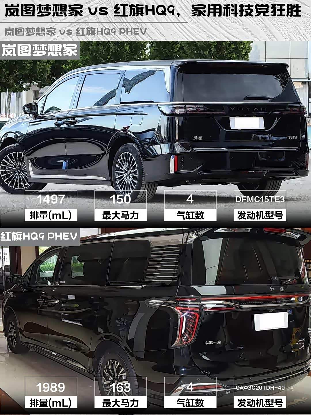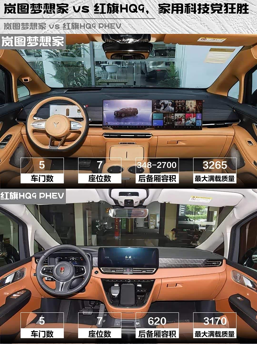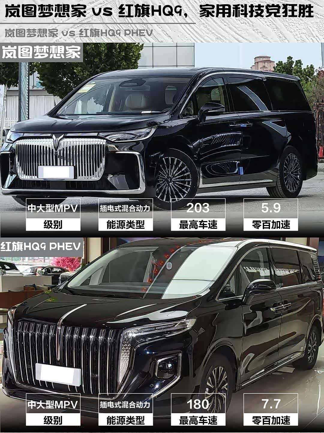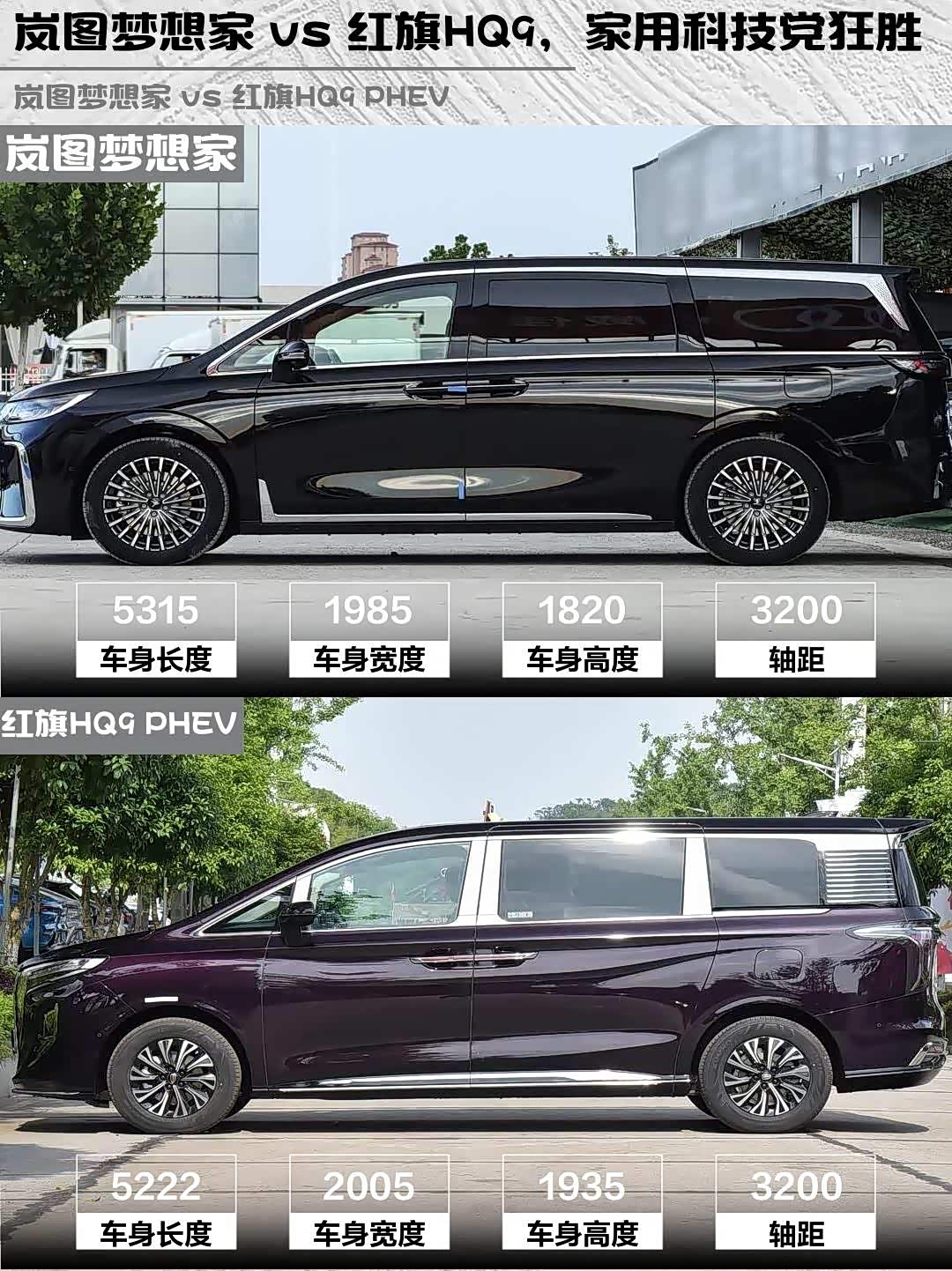总结:家用+科技选岚图梦想家PHEV,动力强、续航长、智驾牛;商务接待选红旗HQ9 PHEV,气场足、座椅奢、品牌硬。两款都是国产高端MPV精品,你会pick谁?