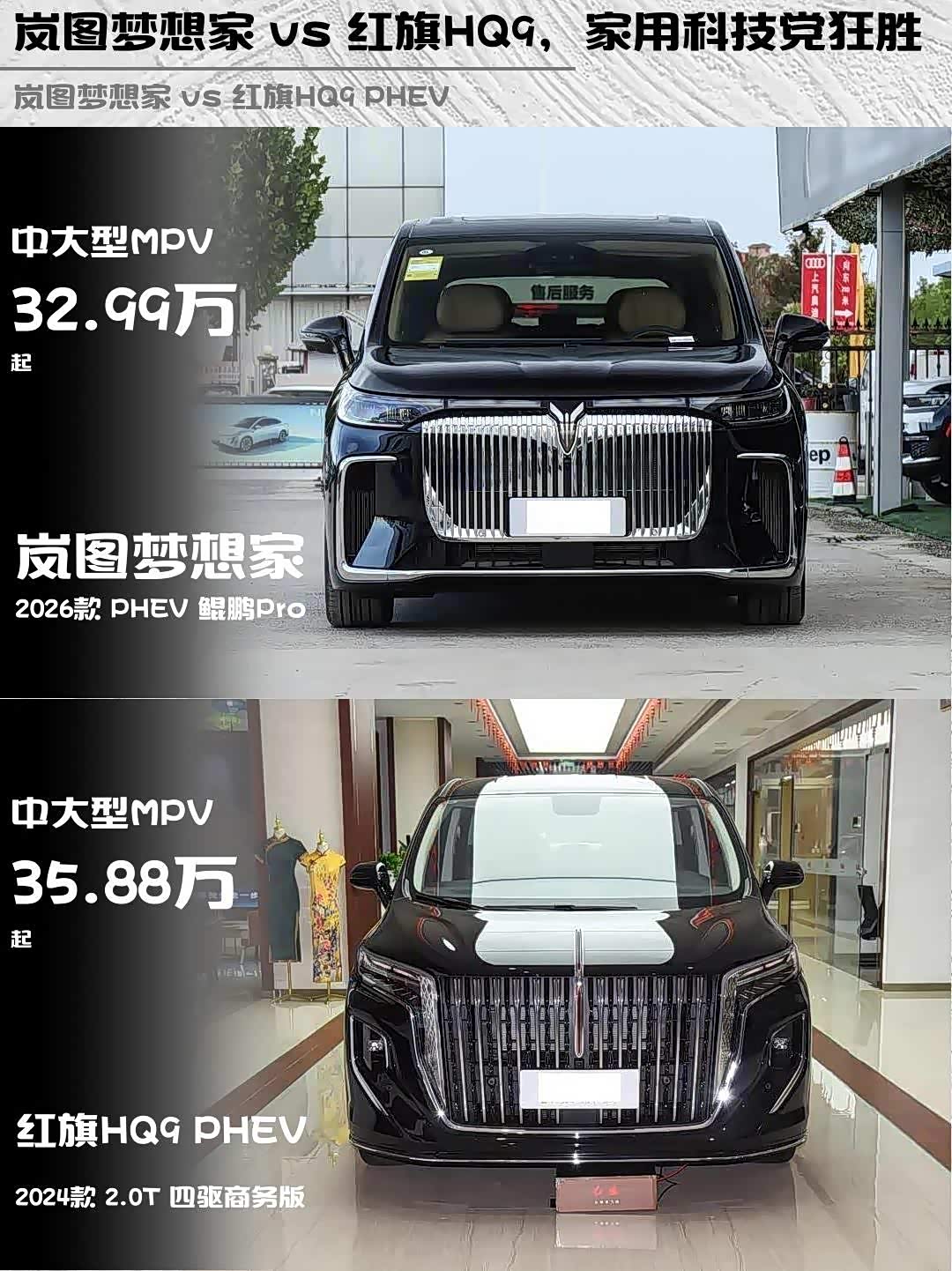 岚图梦想家PHEV鲲鹏Pro 32.99万,五年10万公里质保;红旗HQ9 PHEV 35.88万,质保政策稍短。岚图配置更丰富,性价比突出;红旗品牌溢价高,适合看重商务属性的用户。