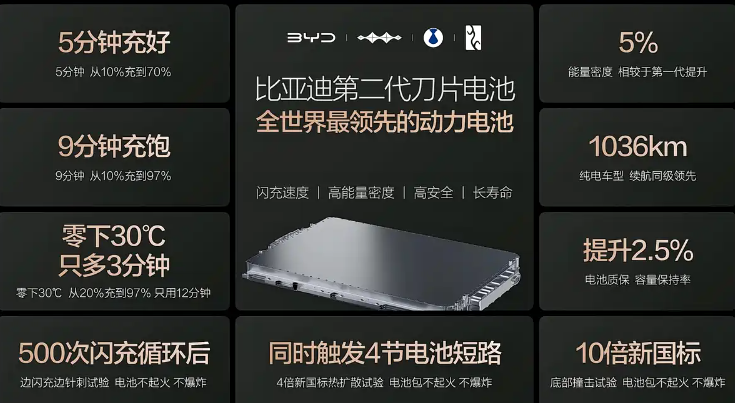 外观、内饰、智能化方面的升级,的确对消费者有着很强的吸引力,不过这次升级最显著的变化还是体现在动力系统上。3月初比亚迪发布了全新的第二代刀片电池以及兆瓦闪充2.0技术,并且迅速搭载于比亚迪旗下各条产品线上,新款腾势D9就是其中之一。