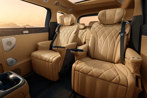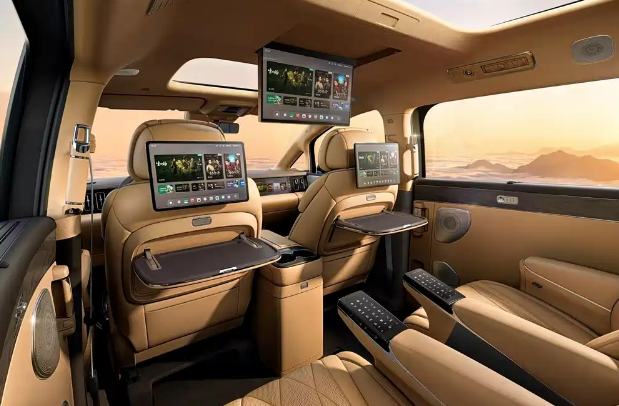 与此同时,新车还保留了二排靠背屏幕、小桌板、扶手电子显示屏等配置,车顶则增加了吸顶式大屏,虽然不像问界系列车型的银幕那样酷炫,但实用价值也是非常高的,适合进行一些商务办公、视频会议,同时也给家庭用户提供了一个精致且私密的车内娱乐空间。
