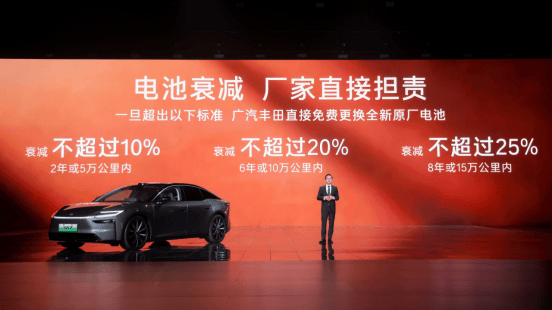 对于用户顾虑的电池衰减问题,铂智7以更严苛的条件作为电池寿命设计前提,植入丰田严苛的“全周期0析锂”安全要求,叠加精准的电压保护策略,有效延长电池使用寿命,减少电池衰减。凭借强大的品质底气,广汽丰田给出明确的电池衰减担责承诺:电池衰减2年或5万公里内超过10%、6年或10万公里内超过20%、8年或15万公里内超过25%,厂家直接担责,免费为用户更换全新原厂电池,彻底解决用户“电池衰减无保障”的后顾之忧。