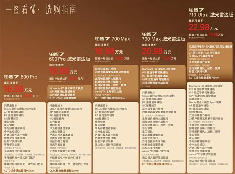顶配710 Ultra激光雷达版限时补贴权益价19.98万,不仅集齐鸿蒙座舱和激光雷达智驾、双腔空悬、零重力座椅、23扬声器等全豪华配置,实现豪华“一步到位”,还有27英寸全景HUD抬头显示、NAPPA真皮方向盘和座椅、智能香氛系统等配置,可谓同价位中超值选择。