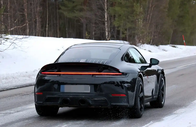 尾部变化集中在扰流板区域,新车测试车采用了主动式扰流板设计,取代了现款911 Dakar上使用的固定式结构。主动式扰流板通常能够根据车速、行驶状态自动调节角度,在高速稳定性和风阻控制之间寻找平衡。对于一款强调多场景使用的车型而言,这类设计可以在公路行驶时提升空气动力学表现,同时在越野环境中减少结构外露带来的影响。