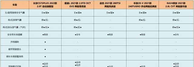 在安全配置方面,长安CS75PLUS同样下足了功夫。从下表可以看出,在以下对比车型中,长安CS75PLUS不仅配有主/副驾驶座安全气囊、前排侧气囊和前/后排头部气囊,同时还配备了并线辅助、疲劳驾驶提示、倒车车侧预警系统、自动泊车等,这些在其它车型身上也是没有的。