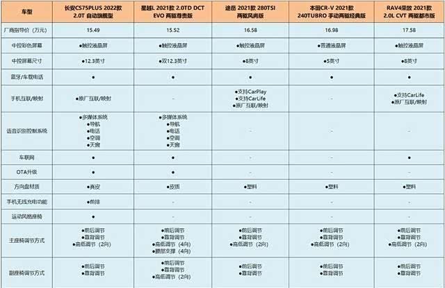 从下表可以看出,大众途岳、丰田RAV4、本田CR-V的最低配比长安CS75PLUS、星越L的中高配贵了不止一丢丢,关键是售价贵了,配置还不丰富,例如方向盘采用的是塑料材质,不带语音识别控制系统等,在这三款合资车型身上是没有的。反看长安CS75PLUS和星越L,可谓诚意十足,特别是长安CS75PLUS,像运动风格座椅、车载空气净化器、负离子发生器这些配置,其它几款车型都是没配备的。