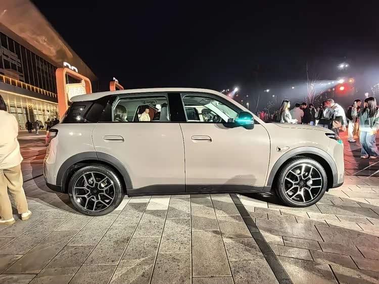 车身侧面紧凑干练,轮眉宽厚,D柱熏黑还加了小装饰。轮圈18英寸。尺寸方面,长宽高是4270/1810/1635mm,轴距2605mm。