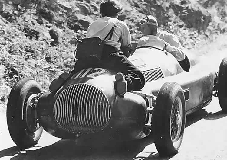 1954年,被绑在250F赛车上的摄影师,正在拍摄方吉奥精妙的驾驶技术