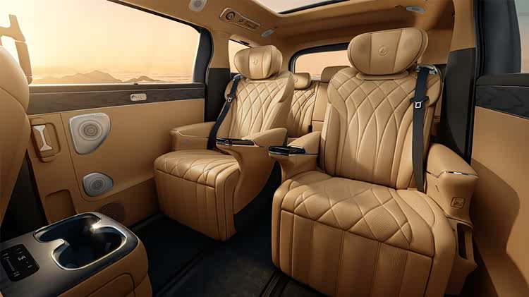 内饰变化幅度超过外形,使用电子怀挡后,空调出风口、控制按键和岛台都进行重新设计,两幅方向盘样式也更简约。而且前舱保留T型布局同时,视觉效果变得更平整。增加的副驾屏还带有折叠桌板,展开后提供和中控屏相同的15.6英寸显示面积——这将是26款腾势D9的标配。而尊荣型的17.3英寸吸顶屏,配合旗舰型的前排椅背磁吸式12.8英寸头枕屏,则让26款腾势D9交互体验达到新高度。