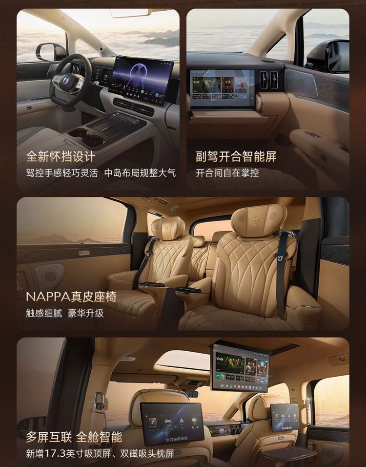 内饰方面进行了诸多升级,比如中控台整体布局有所调整,包括空调出风口造型、副驾屏、全新的电子怀挡、物理按键等都作出一定变化,整体看起来更加清爽简洁,不会显得那么“老气”。与此同时,新车二排保留靠背屏幕的同时、增加了吸顶屏,座椅也进行了更多升级。