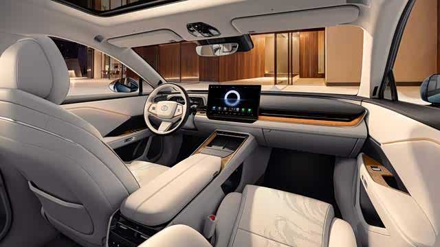 内饰采用了木纹托盘+悬浮岛屿的设计风格,配备了15.6英寸的悬浮式中控大屏、全液晶仪表、AR-HUD形成三屏联动,全系标配华为鸿蒙座舱5.0系统。