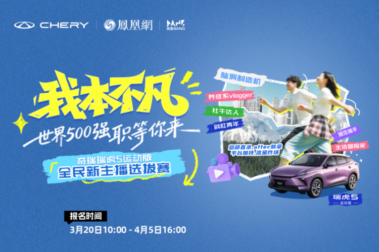 日前,奇瑞汽车联合凤凰网共同发起「我本不凡・世界500强职等你来」 瑞虎5(参数|询价)运动版全民新主播选拔赛,为每一位怀揣热爱的创作者搭建了从兴趣到事业的桥梁。不限国籍,不限年龄,不限职业,这场赛事不仅是展示才华的舞台,更可能是你直通世界500强企业的职业跳板!