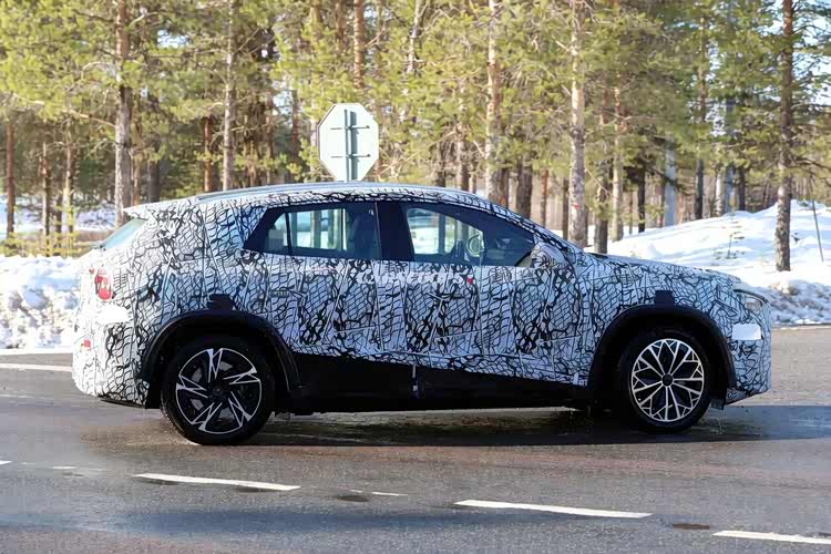 车身侧面,奔驰GLA EQ跟上一代奔驰GLA一样,整个车身都呈现出一种更接近于跨界车的姿态,即车顶向后倾斜、车身线条向前俯冲,这种上下层线条结构所产生的聚合或分离倾向,能够让车辆看上去更有冲击力一些。只是,奔驰GLA EQ似乎比现款更低平,这对于追求空间性的用户来说,可能不是什么好消息。