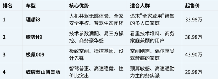 以下是本次评测的四款代表车型——理想i8、腾势N9、 极氪009(参数|询价)、魏牌蓝山智驾版的深度解析。