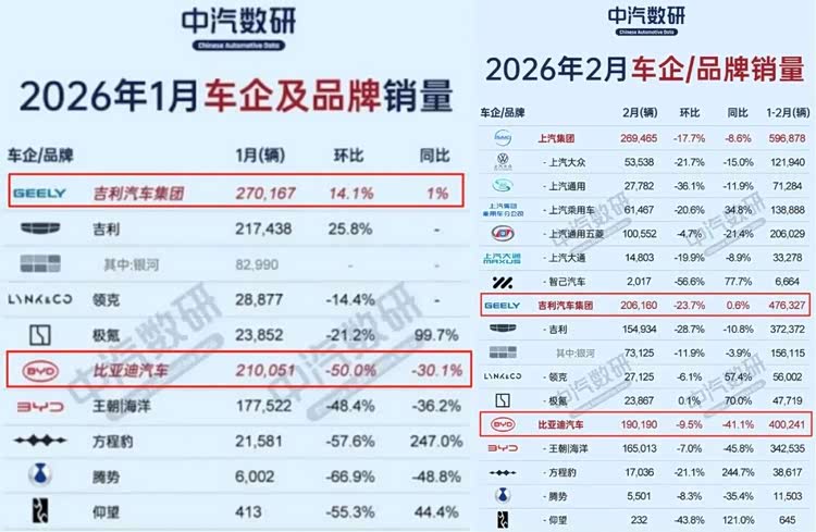 2026年1月,一个数据震动了汽车圈:吉利汽车当月总销量270167辆,比亚迪210051辆。吉利反超了比亚迪。这种趋势在2月得以延续,吉利为206160辆。