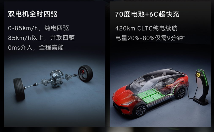 在性能维度上,莲花For Me彻底打破了“电量绑架性能”的行业惯例。系统总功率达到952匹马力,0-100km/h加速仅需3.3秒。更关键的是,即使在电量仅剩10%的极端工况下,其0-100km/h加速仍可达到3.5秒。