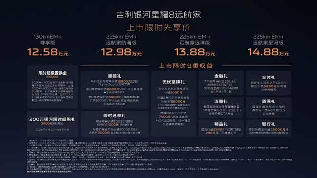 在原有130km EM-i尊享版基础上,吉利银河星耀8远航家系列新增225km EM-i远航家航海版、225km EM-i远航家远洋版、225km EM-i远航家星河版三个续航225km版型,上市限时先享价12.98~14.88万元。即日起,用户可通过吉利银河APP、微信小程序、抖音小程序及官网等官方渠道下定,下定即享9重丰厚购车权益,超高价值,诚意拉满。