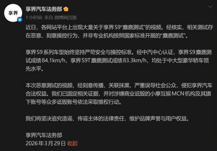 声明直指网络流传的 享界S9(参数|询价)麋鹿测试失控视频存在“恶意、刻意操控行为”,并已对相关MCN机构启动法律维权。