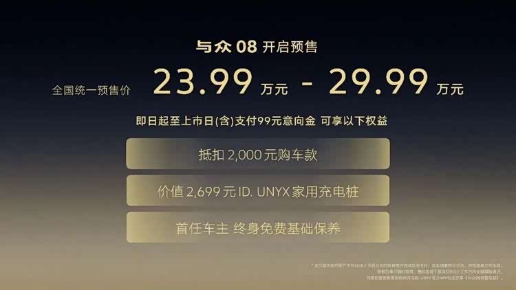 3月26日,大众安徽ID.与众家族全新SUV—— 与众08(参数|询价)正式开启预售,预售价23.99万-29.99万元。要知道这只是预售价,正式价格可能还会有惊喜。