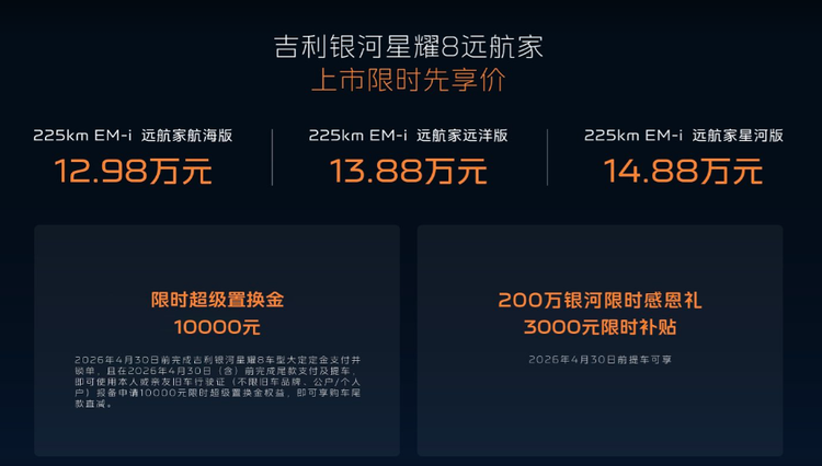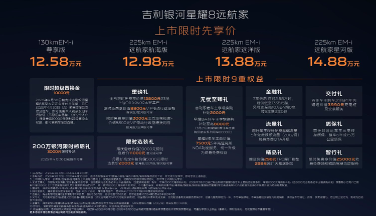 此次远航家系列共推出4款车型,覆盖12.58-14.88万元价格带,相比同级竞品价格优势显著。即日起,用户即可享9重购车权益,涵盖购车、用车、售后全周期,进一步提升产品性价比。