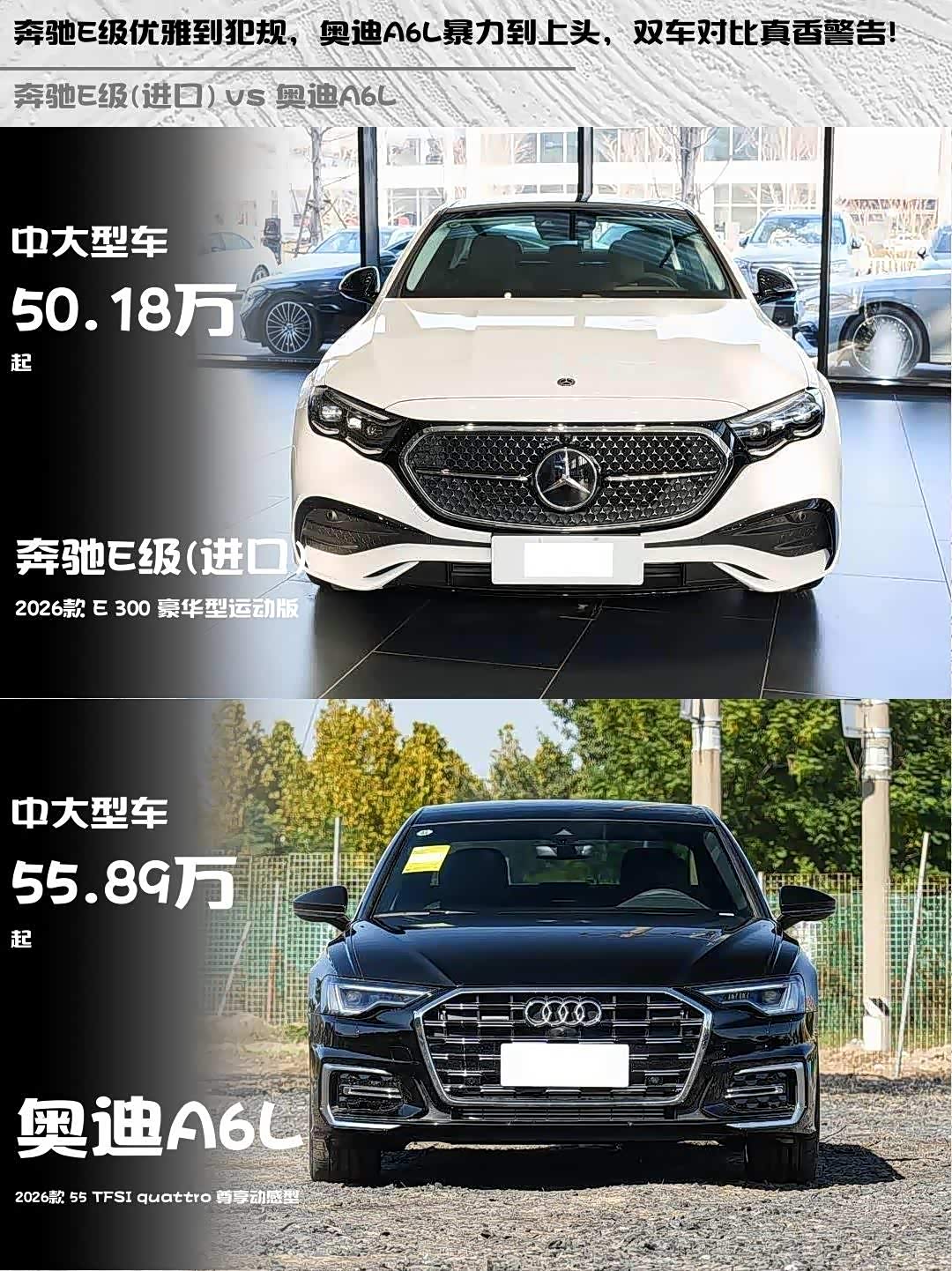 车家号·0浏览·2026-03-31 08:30 · 北京奔驰E级(进口)(参数|询价) 2026款 E 300 豪华型运动版 vs 奥迪A6L 2026款 55 TFSI quattro 尊享动感型,谁才是中大型豪华轿车的天花板?🤔