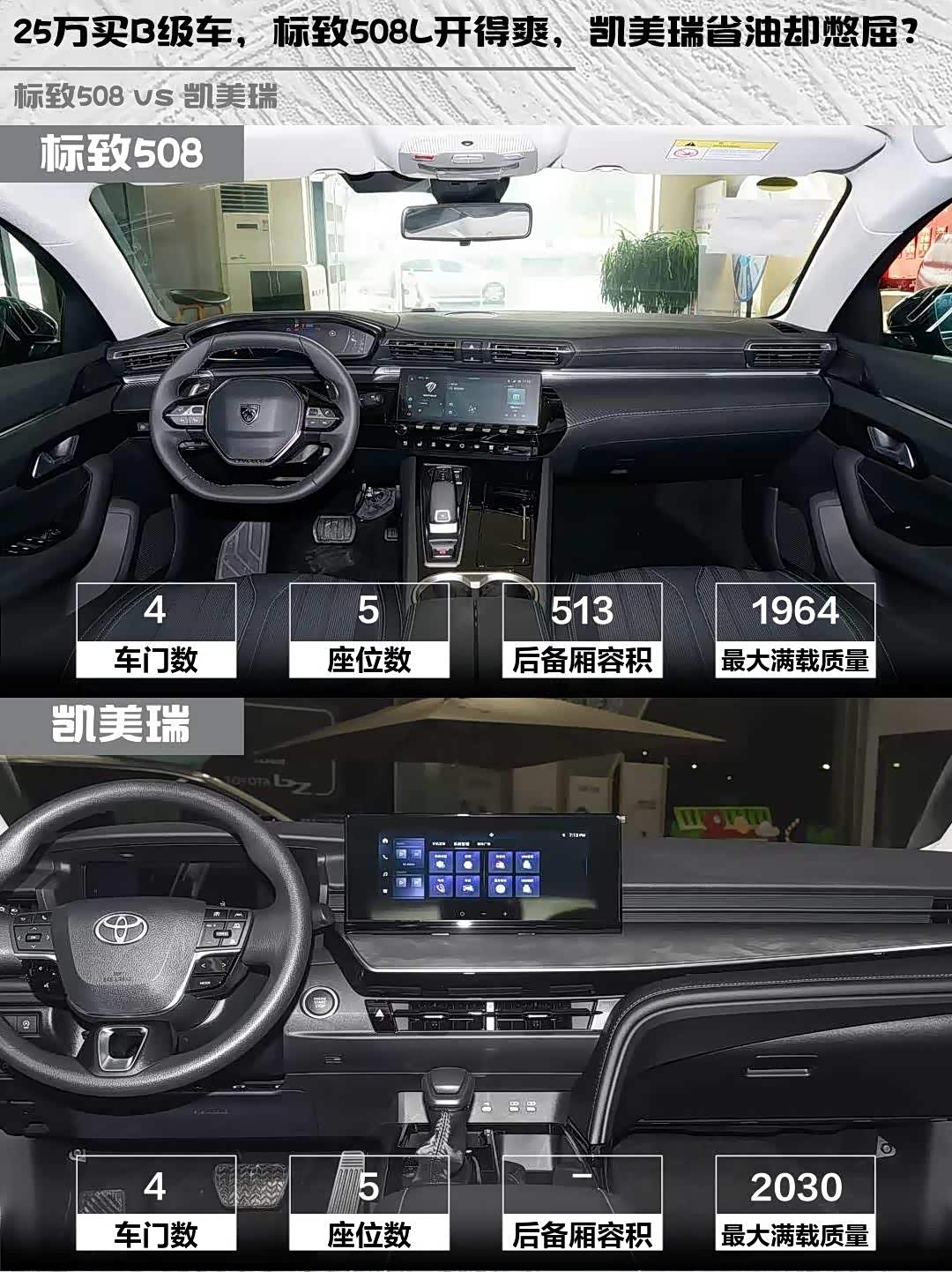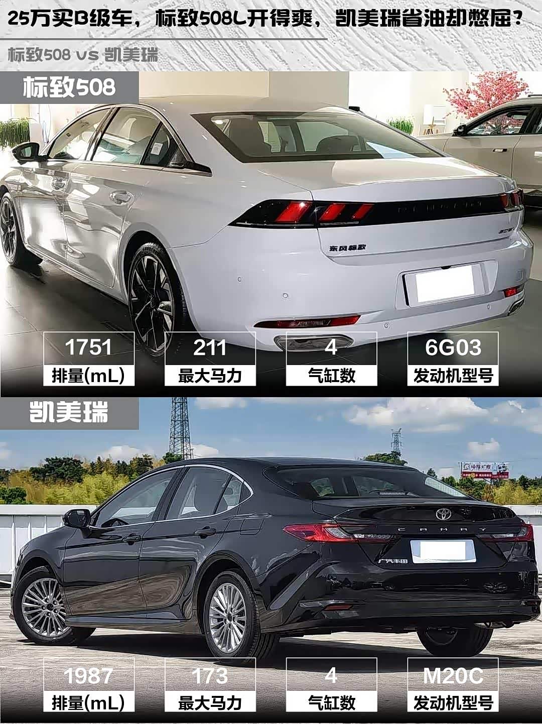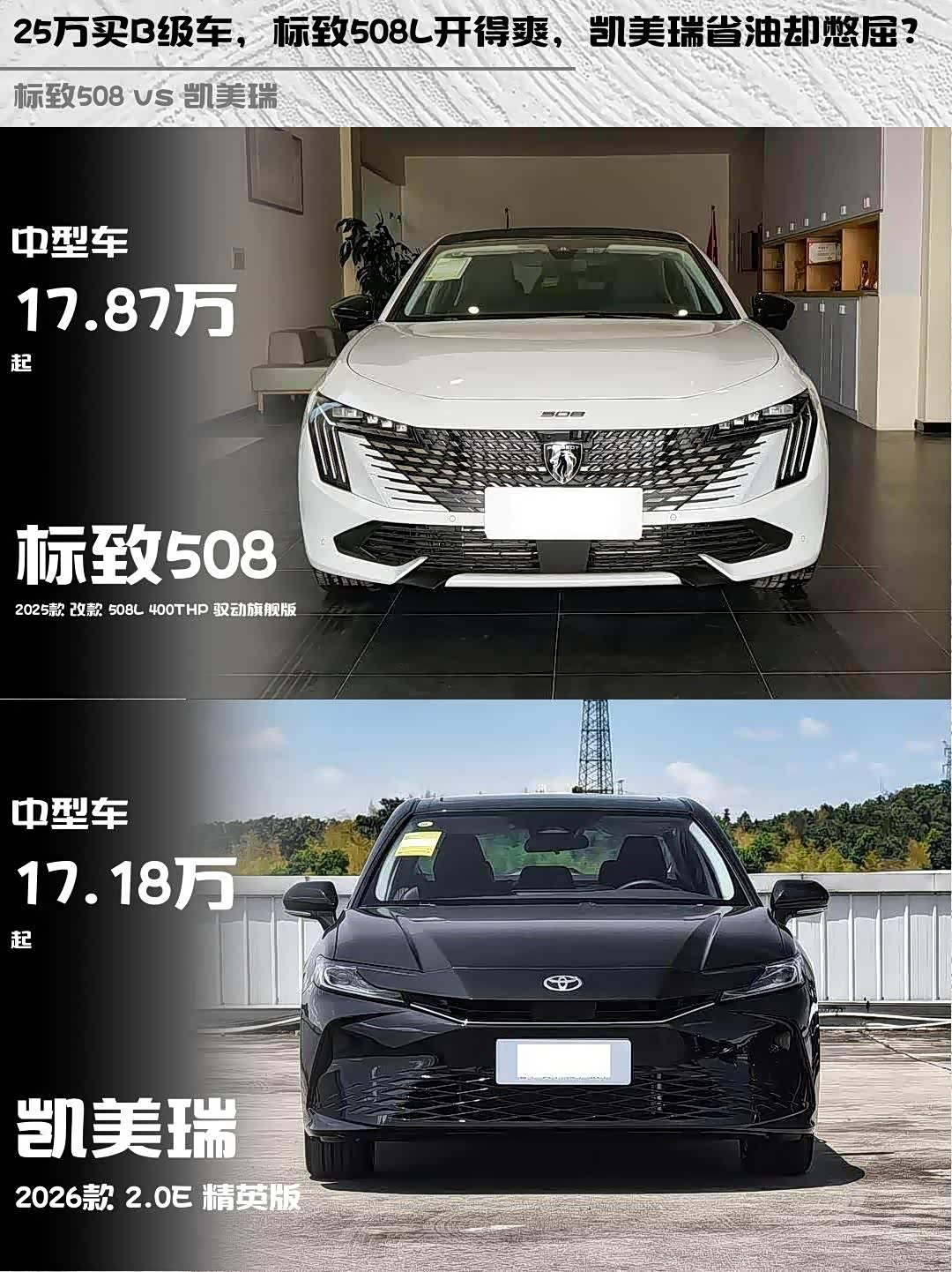 最近后台好多兄弟问:25万预算想买台B级车,在标致508L 400THP驭动旗舰版和凯美瑞2.0E精英版之间纠结。作为开过这两台车的老司机,今天就从5个维度给大家掰扯清楚!