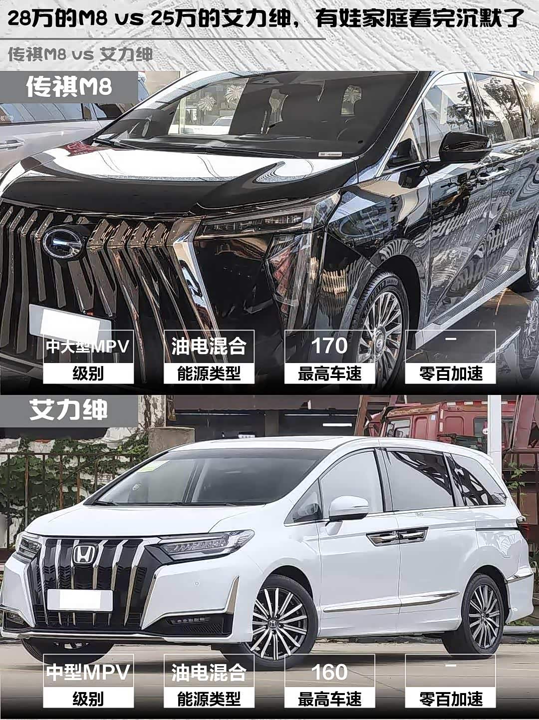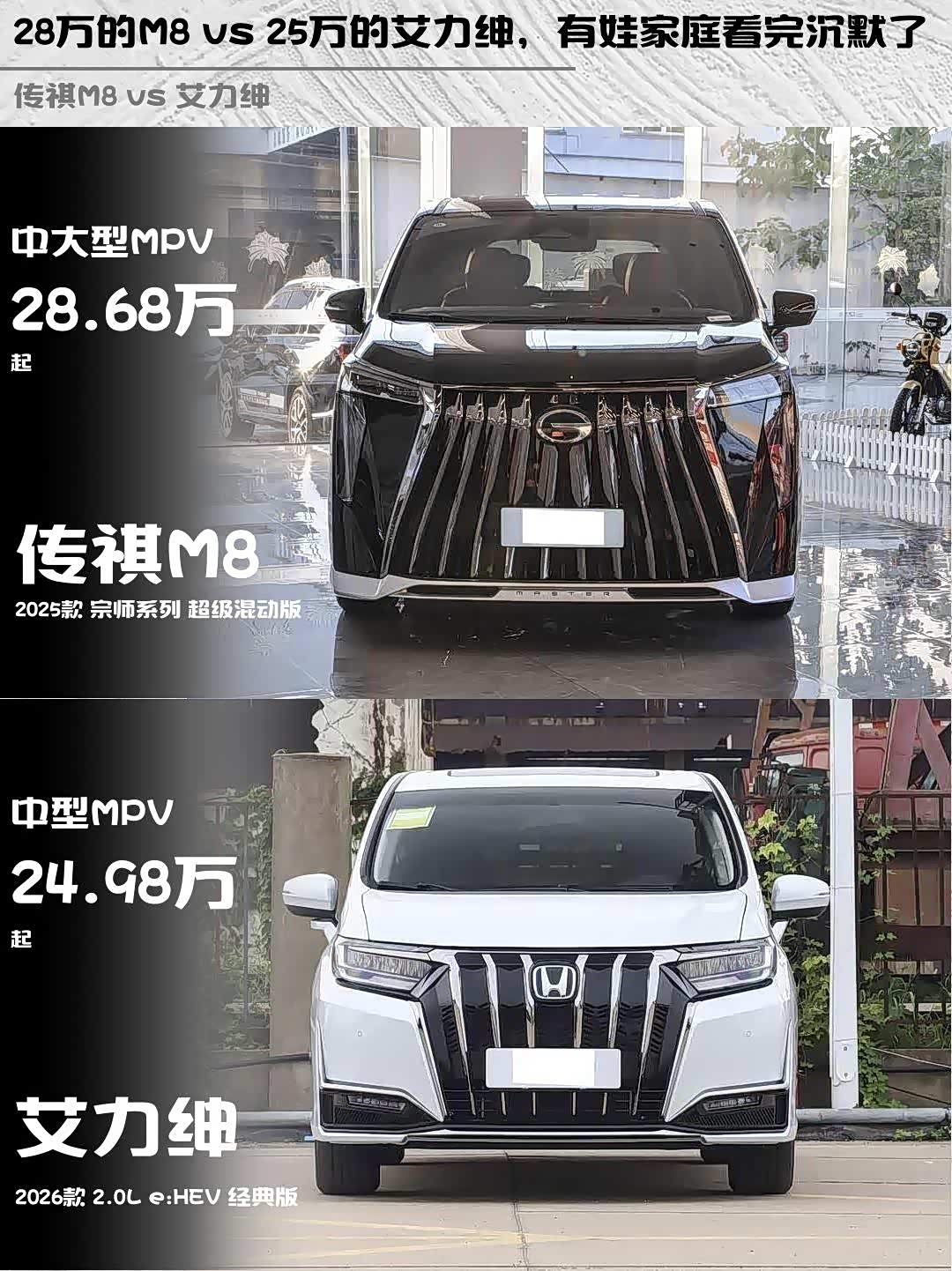 车家号·0浏览·2026-03-31 08:45 · 北京最近在选家用MPV的朋友看过来!今天深度对比两款热门混动MPV: 传祺M8(参数|询价) 2025款宗师超级混动版 vs 艾力绅2026款2.0L e:HEV经典版,干货直接拉满👇