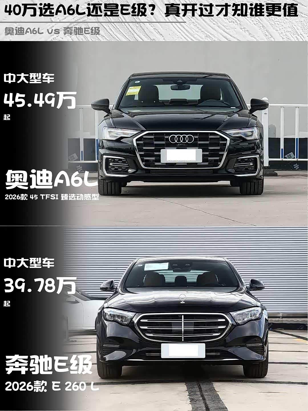 奥迪A6L(参数|询价) 2026款 45 TFSI 臻选动感型 vs 奔驰E级 2026款 E 260 L,这两台德系豪华中大型车该怎么选?作为深度体验过两台车的"老司机",今天就从真实用车场景聊聊它们的差异点✨