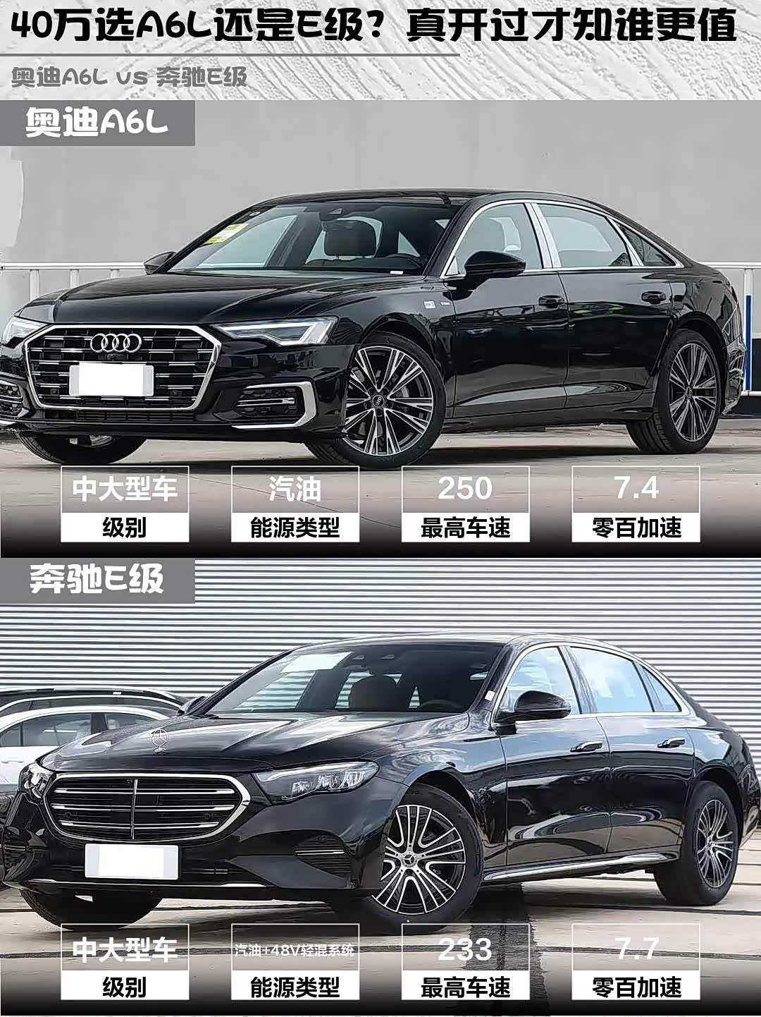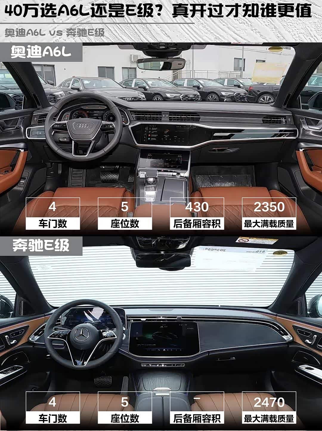 要商务气场+性价比:选A6L臻选动感型,终端优惠后40万内能落地,矩阵大灯+20寸轮毂的气场不输奔驰。要豪华氛围+品牌溢价:选E 260 L,64色氛围灯+发光星辉格栅,晚上解锁时的仪式感值5万!不过要注意奔驰的零整比是奥迪的1.3倍,后期养护成本会高些。