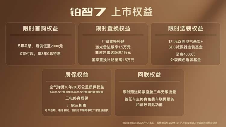 本次,广汽丰田铂智7一共推出5款车型,并且提供了非常全面的上市权益。限时置换补贴:激光雷达版可享受1.5万元厂家置换补贴;非激光雷达版可享受1万元厂家置换补贴;限时选装基金,最高1.4万元:包含1万元双腔空悬+SDC减振器选装基金和最高4000元外观颜色选装基金;限时空气弹簧延保权益:在行业普遍提供5年/15万公里质保基础上,再限时追加5年/15万公里质保权益;首购用户权益:针对首购车主,直接提供5年0息金融方案。所以最终铂智7限时权益补贴价直接来到了14.78-19.98万元。