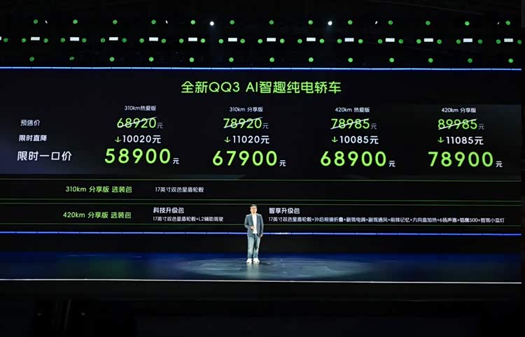 发布会现场公布的数据令人振奋:截至上市前夕,全新QQ3盲订订单已突破6.1万份,预售订单超过4.3万份。在150万用户基盘的热切期待中,这款基于原生智能纯电平台打造的精品小车,凭借“高颜值、大格局、强体魄、更懂你”四大核心价值,正式向全球A0级市场发起冲击。