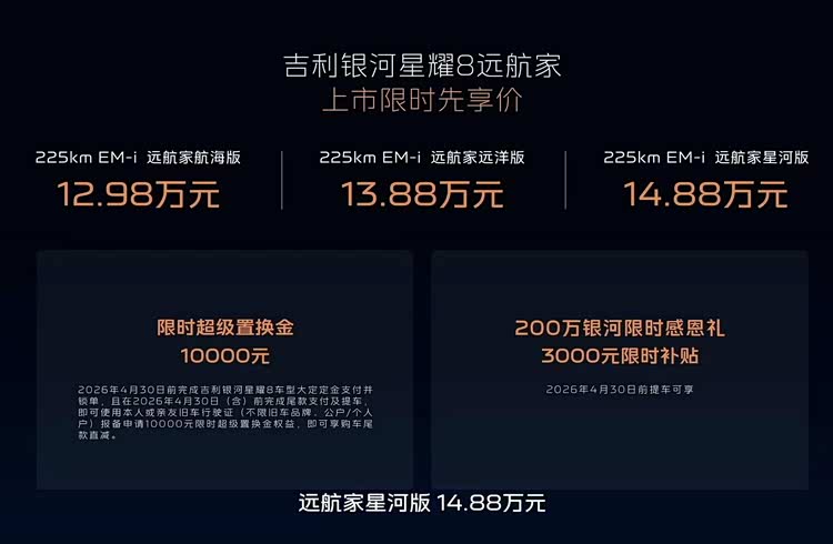 从快充能力到纯电续航,从智能驾驶到座舱豪华,星耀8远航家系列正在用产品力证明:补能焦虑,有解了。12.98万起的价格,加上官方给出的购车权益,对于那些对充电效率有要求的用户来说,这款车的到来,确实值得认真关注。毕竟,15分钟充到80%的体验,确实能改变日常用车的节奏。
