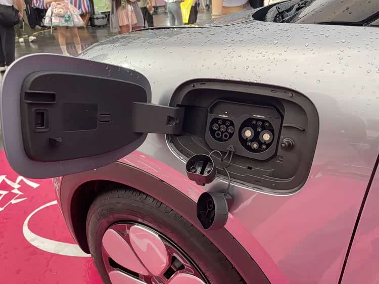 车身侧面的设计也是非常简洁,充电口在左前翼子板,车门把手采用半隐藏式,花瓣造型的轮毂看上去很有个性。