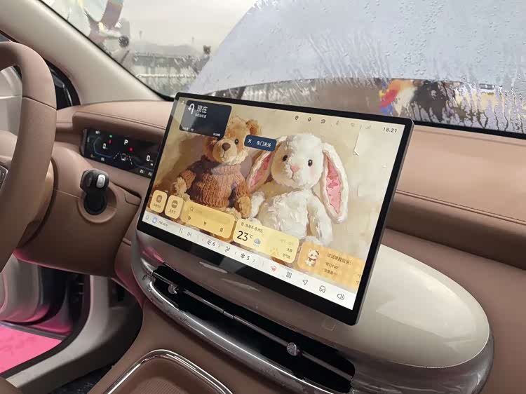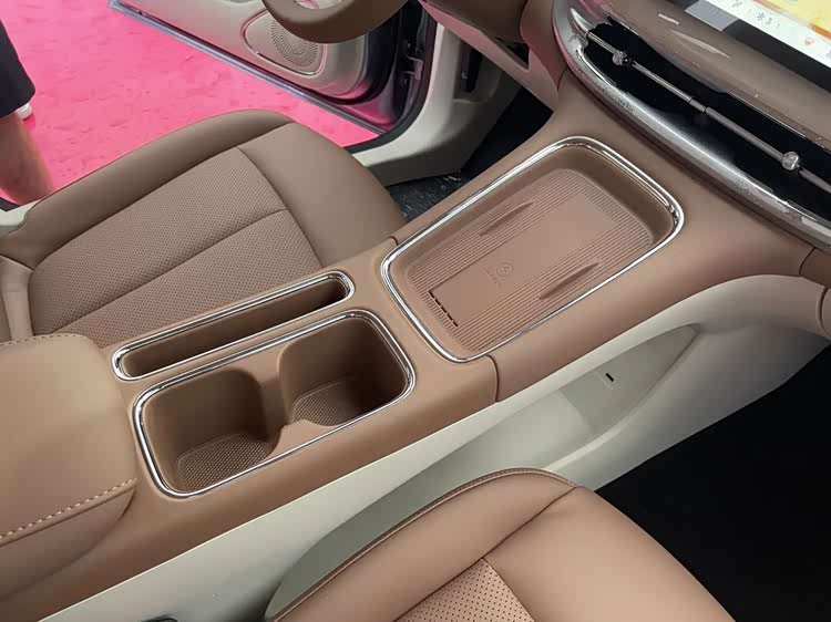 内饰的设计可以看到整体更偏复古风格,且有着许多圆形设计。配色上提供马鞍棕和奶盐米双拼,电子怀挡的设计释放了中央空间,因此在中央区域有双层储物,上层还配备50W无线充电。此外,新车配备全液晶仪表和12.8英寸悬浮式大屏,内置灵语AI系统,支持CarPlay、HiCar及Carlink手机互联等。